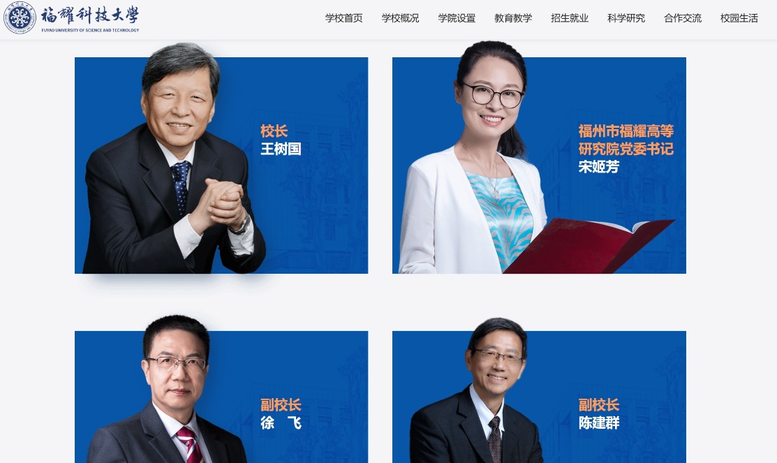 近日,福建福耀科技大学(下文简称“福耀科技大学”)官网更新学校领导页面,该校现任领导正式亮相,分别是校长王树国,福州市福耀高等研究院党委书记宋姬芳,副校长徐飞、陈建群。